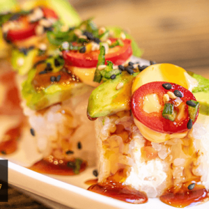 Pera, cheese, fromage cheddar, ciboulette, saumon citronnée, sauce japonaise, piment