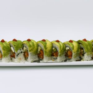 Crevettes tempura, cheese, avocat, saumon, crevette, sauce japonaise, piment rouge