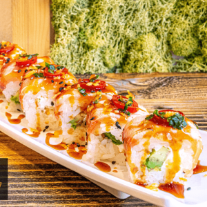 Concombre, cheese, avocat, saumon tataki, ciboulette, schichimi, mayo, chips, piment rouge